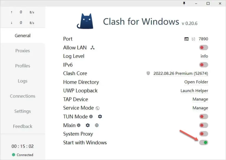 不想要每次重启电脑都要打开软件时,我们可以设置开机自启动,需要点击界面左侧菜单 Profiles 选项卡,找到 Start with Windows 并开启开关即可,开启状态下按钮状态为绿色,如下图所示为开启状态。